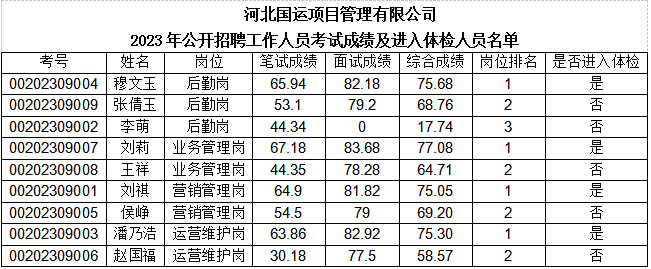 滄州市安居集團(tuán)有限公司2023年公開招聘工作人員面試于2023年9月14日完成。現(xiàn)將綜合成績(jī)與進(jìn)入體檢人員名單進(jìn)行公示。