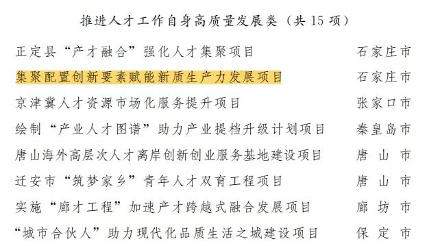 “集聚配置創(chuàng)新要素賦能新質(zhì)生產(chǎn)力發(fā)展”項(xiàng)目聚焦“四個(gè)面向”目標(biāo)導(dǎo)向,突出“引育留用”關(guān)鍵環(huán)節(jié),以集聚海內(nèi)外人才資源要素、全球性高端智力資源、創(chuàng)新性技術(shù)項(xiàng)目資源、指導(dǎo)性數(shù)據(jù)信息資源、支撐性合作渠道資源等五個(gè)方面為主要舉措,旨在打造具有河北特色和全國影響的招才引智工作品牌,促進(jìn)形成全球人才、智力、技術(shù)等創(chuàng)新要素向河北充分涌動(dòng)的大好局面。
